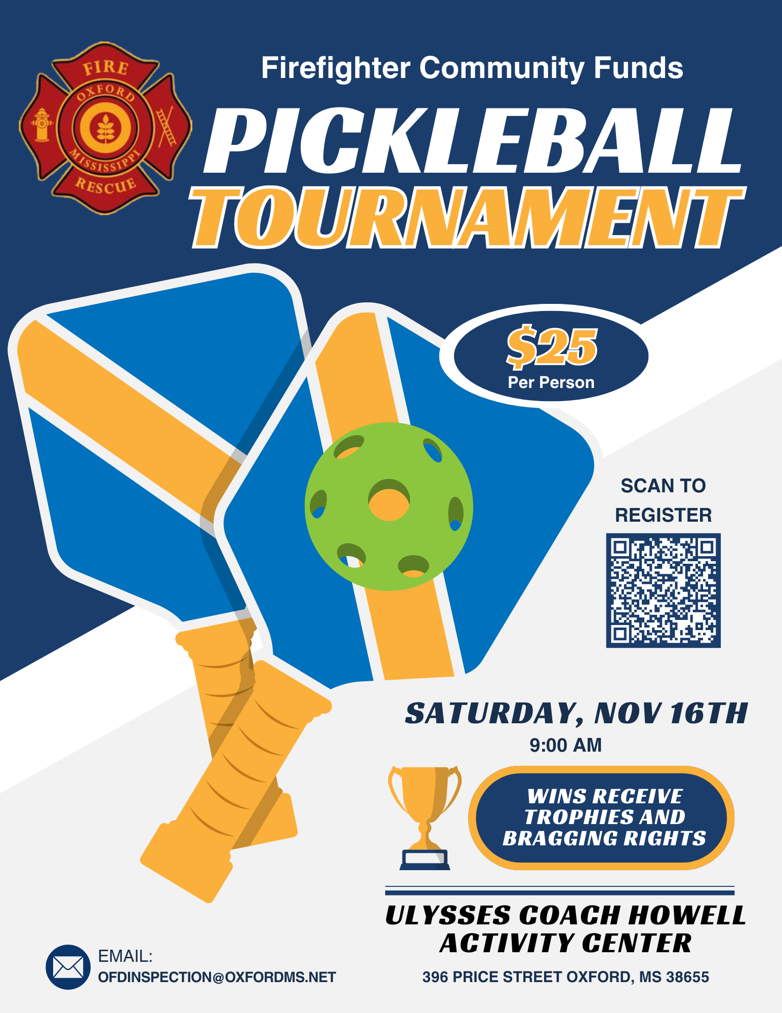 The Oxford Fire Department Pickleball Tournament 2024 held on November 16, 2024. The tournament is a "Round Robin" style tournament and will last one day (warm up is at 8 am and the tournament starts at 9 am). There will be two categories: men's doubles and women's doubles. Each category will be split into 4 groups - Beginner, Intermediate, Proficient, and Advanced. The cost to play in the tournament is $50 per team. 1st, 2nd, and 3rd place medals will be given after each round. The mission of the Firefighter Community Fund is to provide vital support to families and individuals in need throughout our community. We are proud to assist organizations like the Baptist Memorial Cancer Center, provide Thanksgiving meals for low-income families, donate to Toys for Tots, support Commodores Cares, and distribute LovePacks for children in need. With your support, the Firefighter Community Fund will have the privilege of serving over 500 families throughout the L.O.U. community this year. Last year, we provided nearly 2,000 meals and gifts to those in need. Right now, there are over 300 families facing challenges during the holiday season, so our work continues. We invite you to support our efforts by joining us on Saturday, November 16, 2024, for a day of pickleball and networking. By bringing together the community to this event, we are able to amplify the Firefighter Community Fund’s mission and make a meaningful impact in our community.