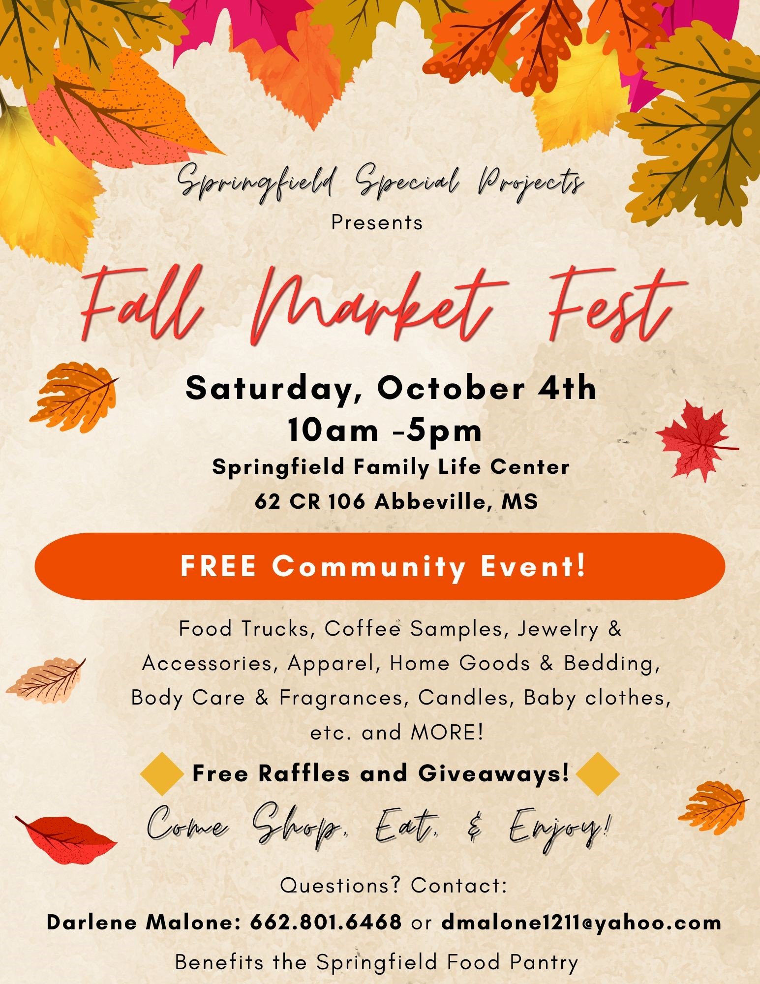 Join Springfield Special Projects’ Fall Market Fest on Saturday, October 4th, from 10AM – 5PM at the Springfield Family Life Center (62 CR 106, Abbeville, MS).