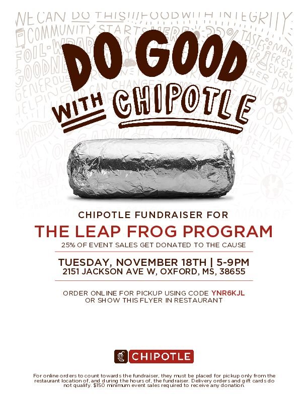 Come grab dinner at Chipotle, where 25% of event proceeds are donated to the Leap Frog Program! Only purchases made from 5pm - 9pm on November 18th will qualify. Make sure to leave your receipt in the buckets on the counter to be counted! We hope to see you there!