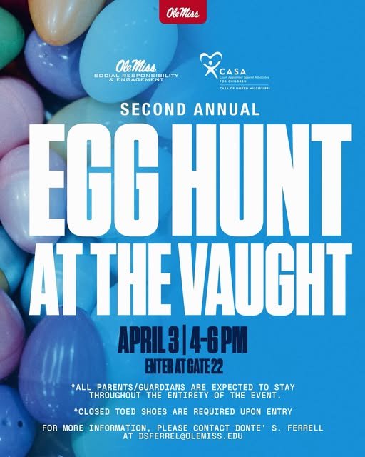 We are excited to announce the Second Annual Easter Egg Hunt at Vaught-Hemingway Stadium on Friday April 3, from 4:00–6:00 PM! Join CASA and Ole Miss Athletics for a FREE, family-friendly afternoon featuring 20,000 Easter eggs, inflatables for all ages, games, and photos with the Easter Bunny.